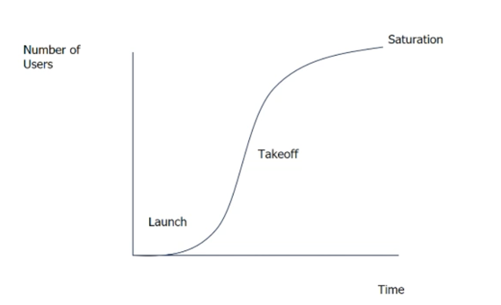 Adoption dynamics of a new product: Launch ➡️ Takeoff ➡️ Saturation.